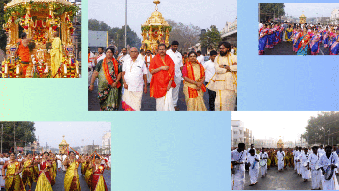 అనంతరం భక్తుల శివనామస్మరణతో వేదమంత్రాల నడుమ ఉదయం గం.7.30లకు ఈ స్వర్ణరథోత్సవం ప్రారంభమైంది. గంగాధర మండపం నుంచి నందిమండపం వరకు తిరిగి అక్కడి నుండి నంది మండపం వరకు ఈ రథోత్సవాన్ని జరిపించారు.