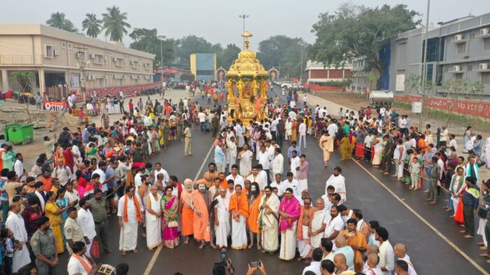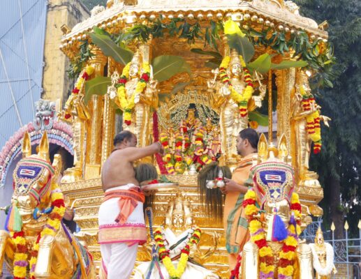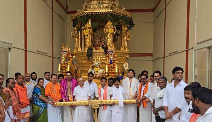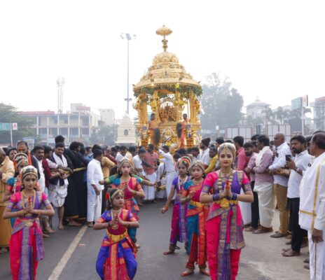 స్వర్ణ రథోత్సవంలో ముందుగా, దేశం శాంతి సౌభాగ్యాలతో విలసిల్లాలని, అతివృష్టి అనావృష్టి నివారించబడాలని, ప్రకృతి వైపరీత్యాలు సంభవించకుండా సకాలంలో తగినంత వర్షాలు కురిసి దేశం పాడిపంటలతో తులతూగాలని, జనులందరికీ ఆయురారోగ్యాలు కలిగి వారికి అకాల మరణాలు రాకుండా ఉండాలని, దేశంలో అగ్నిప్రమాదాలు, వాహన ప్రమాదాలు మొదలైనవి జరగకుండా ఉండాలని, ప్రజలందరూ సుఖశాంతులతో ఉండాలంటూ ఆలయ అర్చకులు లోకకల్యాణానికాంక్షిస్తూ సంకల్పాన్ని పఠించారు. తరువాత రథారూఢులైన శ్రీస్వామిఅమ్మవార్లకు విశేషపూజలు జరిపారు.